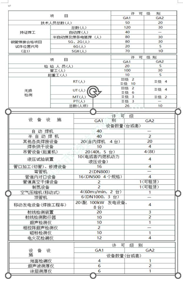 注3:從事長(cháng)輸管道(GA2)改造、重大修理的壓力管道安裝單位,其人員、生產(chǎn)場(chǎng)地、安裝設備及檢驗與試驗裝置除需滿(mǎn)足長(cháng)輸管道 (GA2)安裝單位相應要求外,還應當具有以下條件: