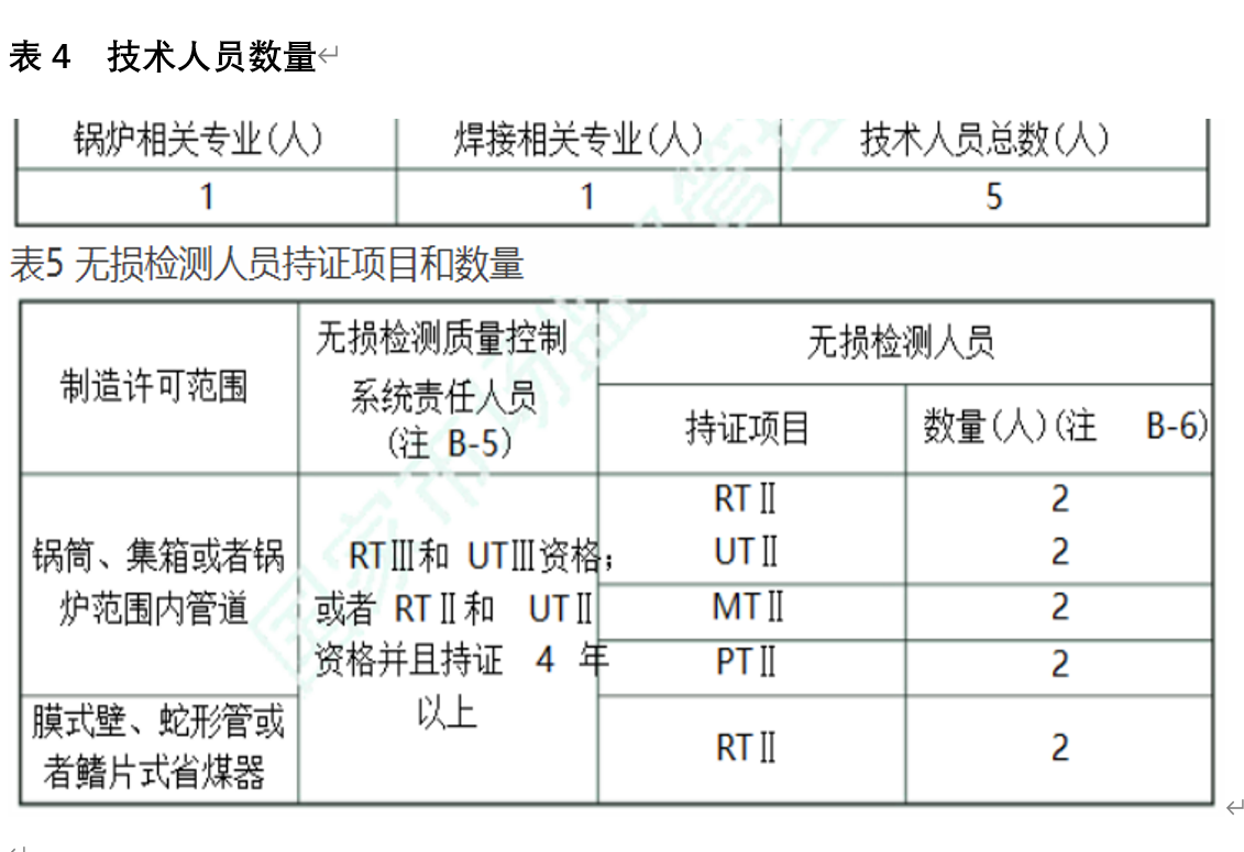 注5:無(wú)損檢測外委的,制造單位只需要按照表5 的要求配備無(wú)損檢測質(zhì)量控制系統責任人員。